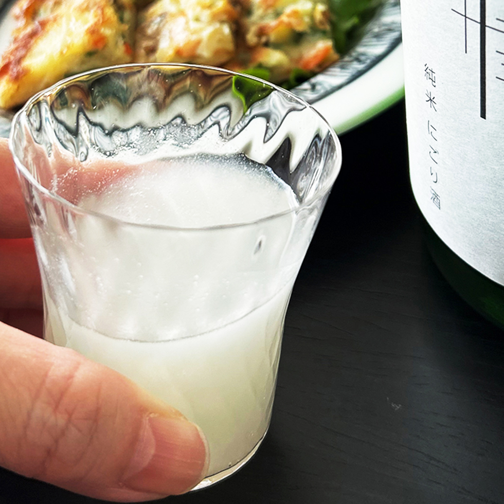 通常は、細かい目の袋を使うことで、透明な酒にするのですが、にごり酒は粗い目の袋を使って濾すため、滓(おり)が残り、白く濁った見た目のお酒になります。
